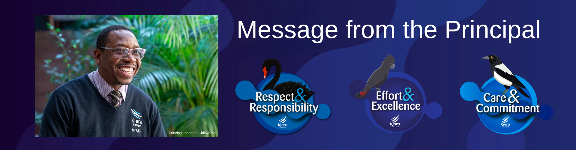 I am Innocent Chikwama, Principal of Kiara College. It is an honour to lead such a vibrant, multicultural, and dynamic school community. Kiara College is a place with a proud history and a bright future, strengthened by the strong partnerships we share with staff, students, and families.